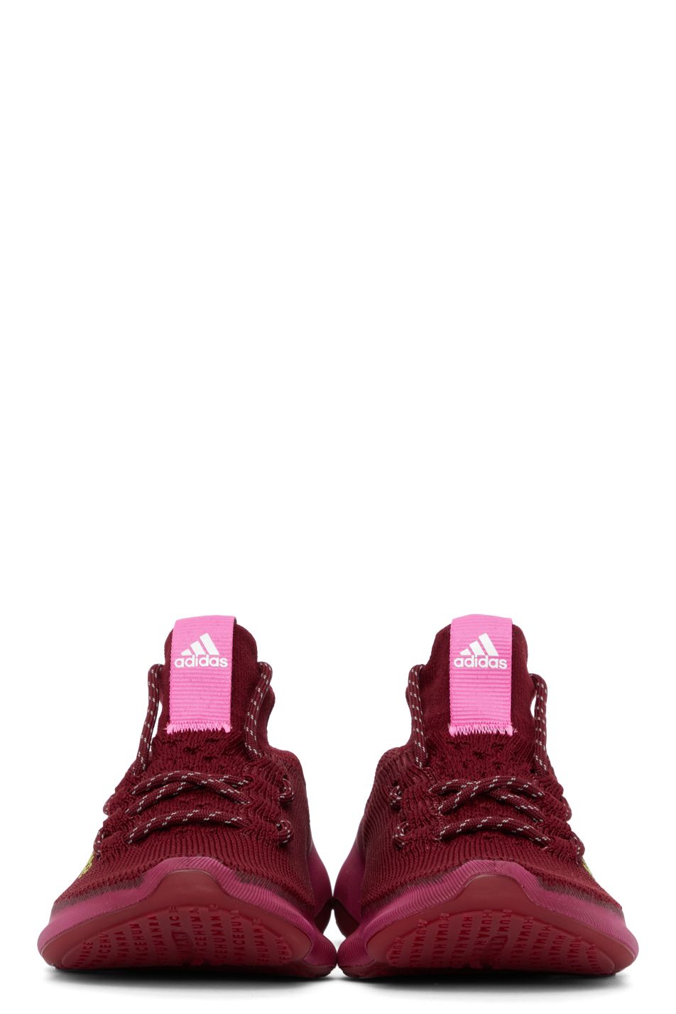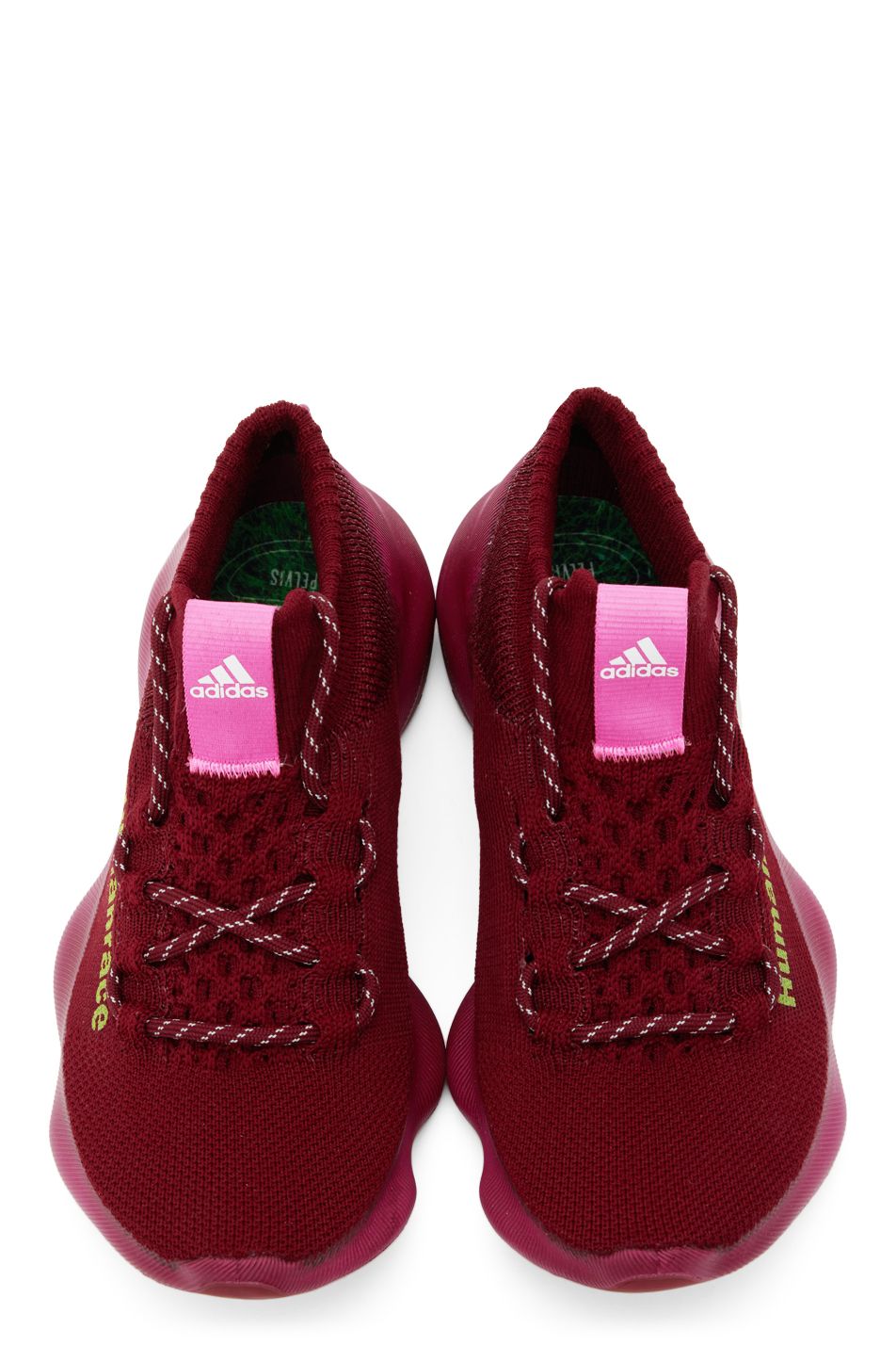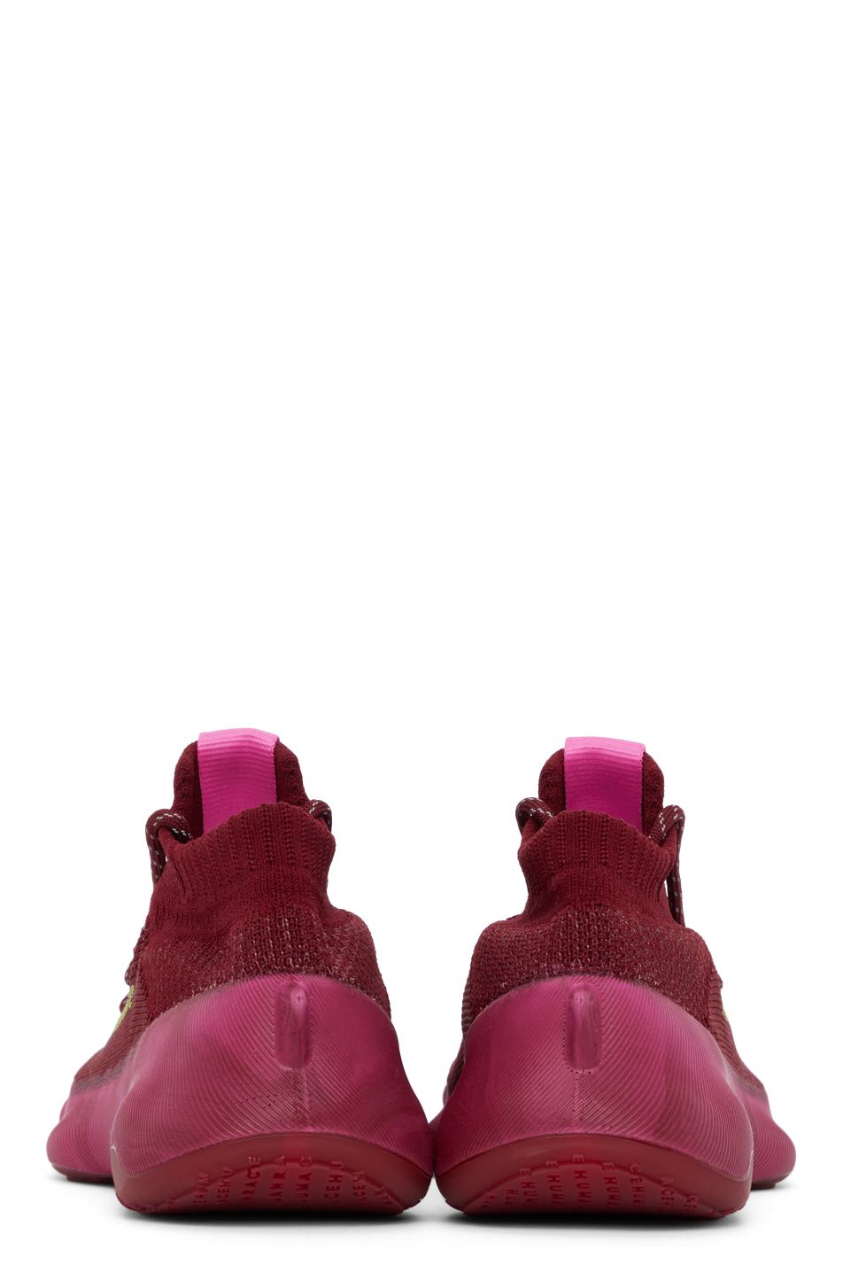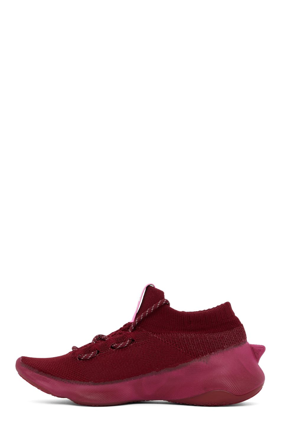 Mid-top knit sneakers in burgundy. Round toe. Laces woven in blue and grey. Webbing pull-loop in pink featuring logo bonded in white at collar. Rib knit collar. Logo printed in green at outer side. Textured sculptural rubber midsole in burgundy featuring rubberized logo flag at heel. Tonal treaded rubber sole featuring embossed logo pattern. Alternate laces woven in burgundy and grey included.