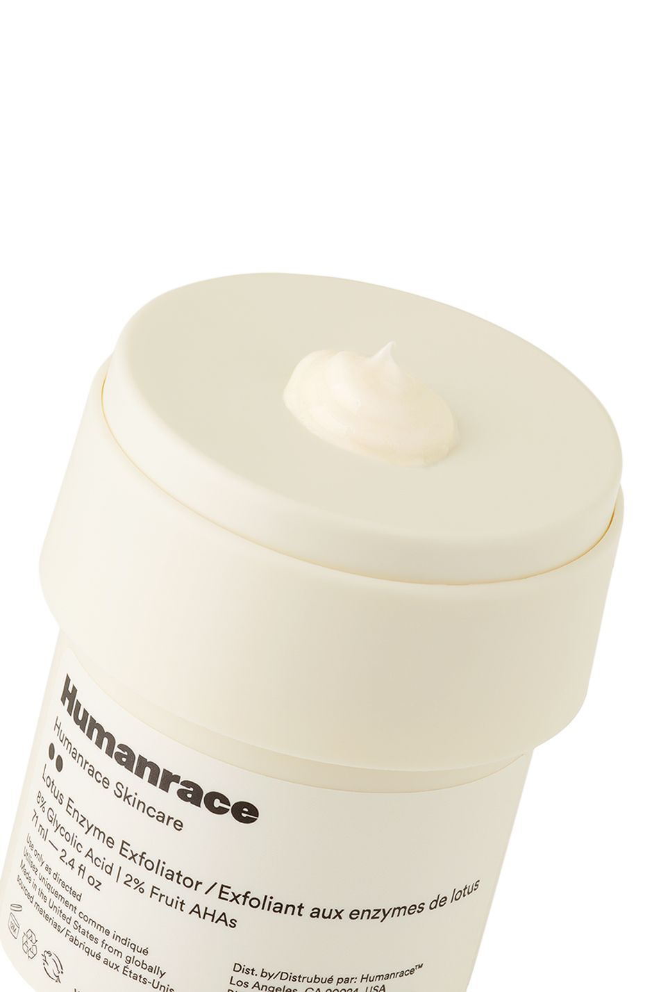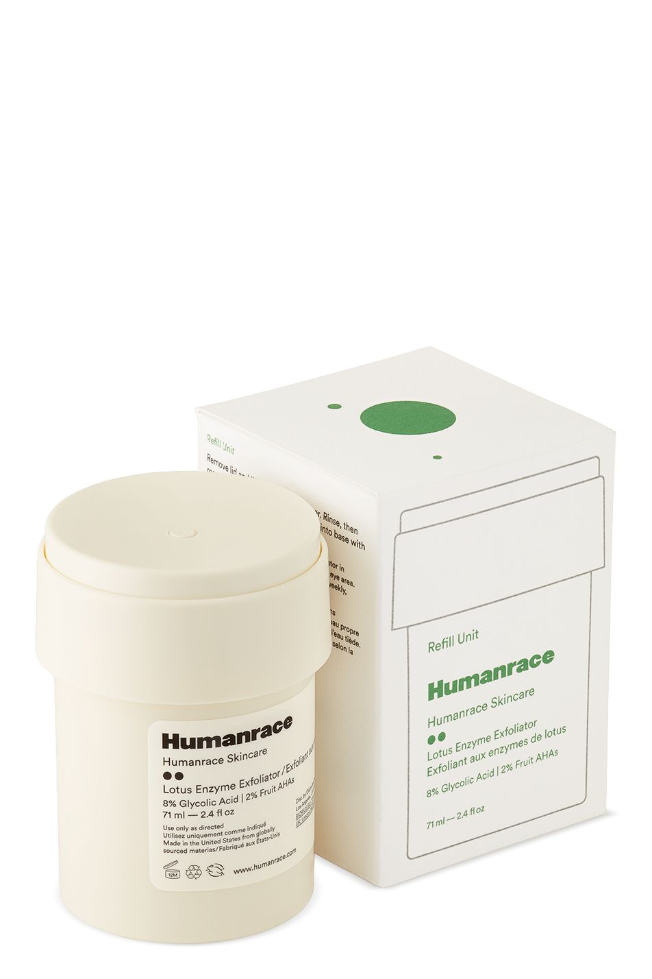 Facial exfoliator refill for smoothing, renewing, and revitalizing skin. Features glycolic acid, fruit AHAs, micronized rice particles, and lotus leaf. Suitable for all skin types. Free of fragrances and gluten. Vegan and cruelty-free. Recyclable packaging.