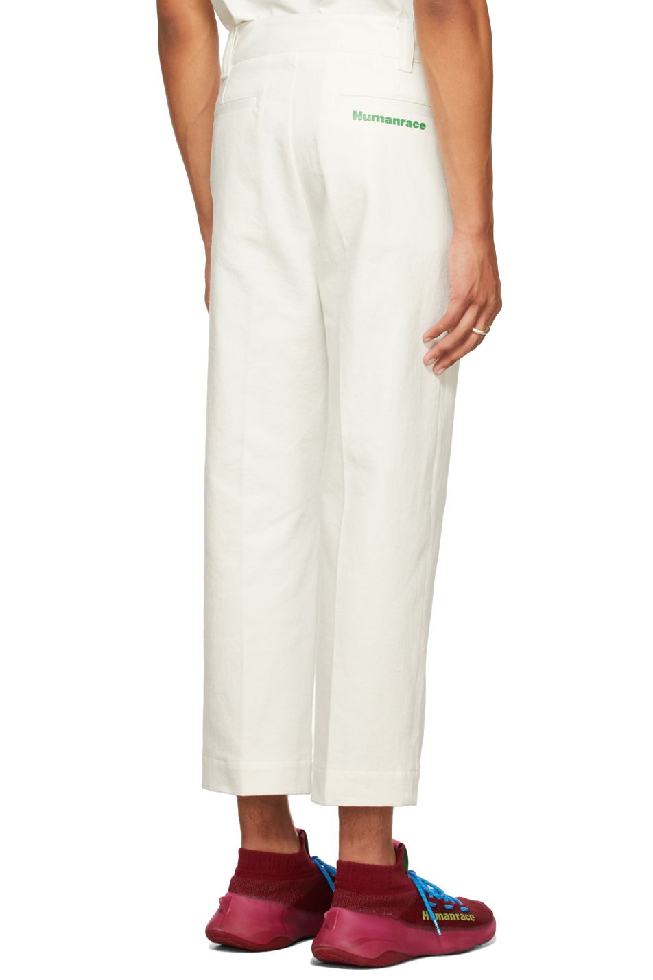 Straight-leg organic cotton and recycled organic cotton-blend twill trousers in off-white. High-rise. Cropped leg. Four-pocket styling. Belt loops at waistband. Text embroidered in green at front pocket. Logo bonded in green at back pocket. Central creases at front and back. Zip-fly. Tonal and silver-tone hardware.