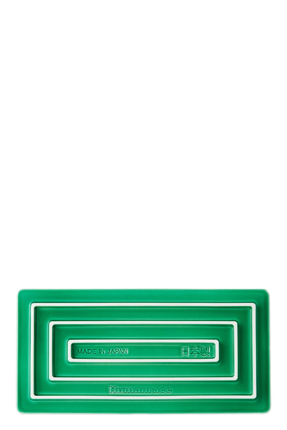 Handcrafted ceramic tray in white. Logo flocked in grey at face. Painted detailing in green and engraved logo at base.